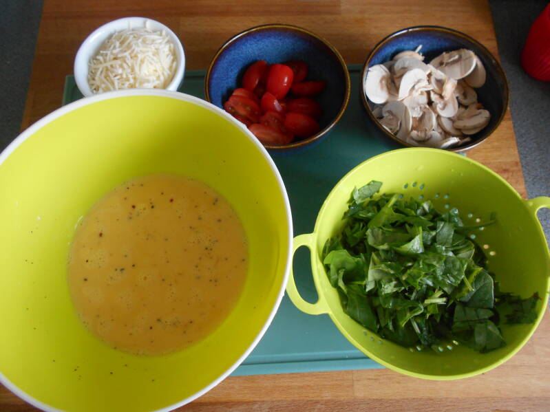 - verdeel het eimengsel over de muffinvorm, vul elk vormpje voor 3/4e