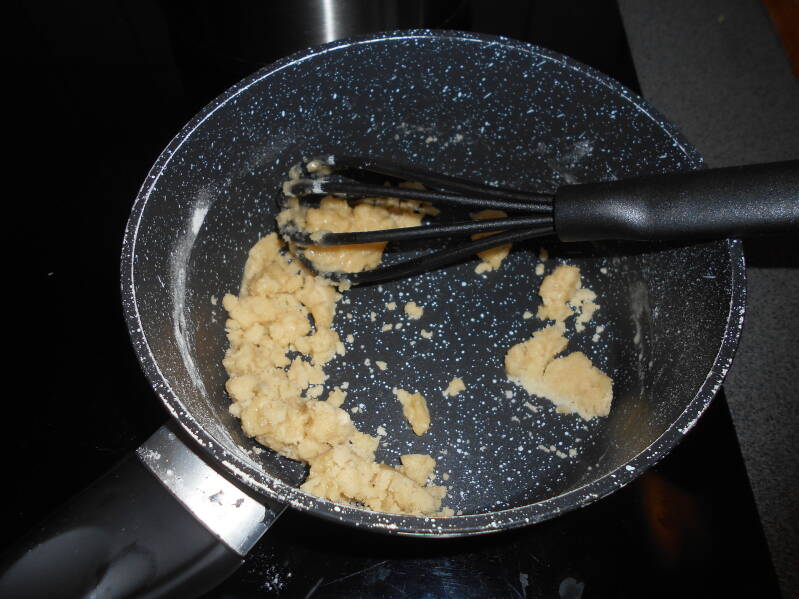 Als de boter gesmolten is, voeg je de bloem toe en meng goed.