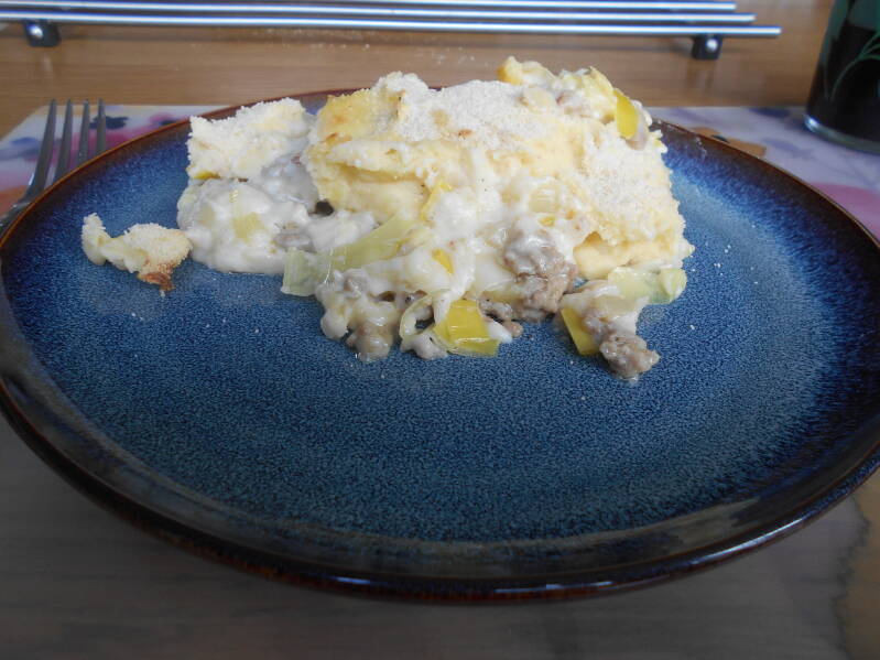 Giet vervolgens de mengeling van prei en bechamelsaus over het gehakt.